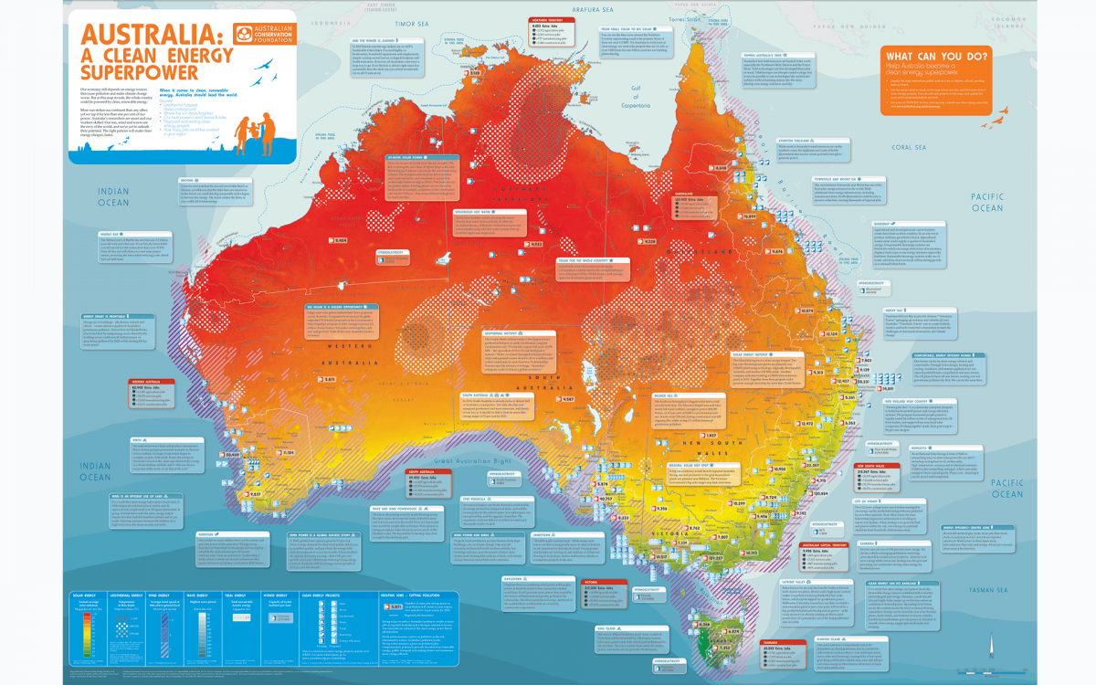 When it comes to clean, renewable energy, Australia should lead the world. Australia: A Clean Energy Superpower is a map that illustrates how all of Australia could be powered by clean, renewable energy. Australia’s sun, wind, waves and hydro energy are the envy of the world and we are yet to unleash their potential. This A2 sized map was created for the Australian Conservation Foundation in 2010.